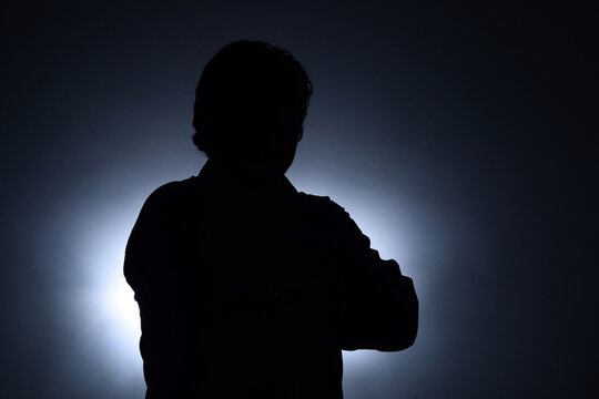 Hidden face in silhouette of an enigmatic man in the shadow.