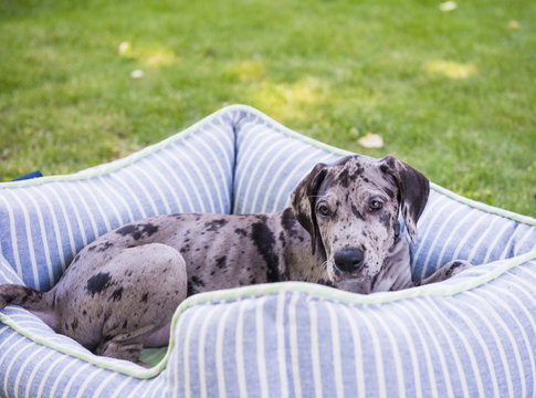 Gray and Black Great Dane Puppy Relaxing in Shady Yard