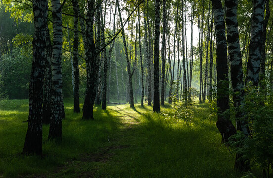 Birch forest, shady path, emerald green grass. From under the shady birches the path leads to a sunlit glade.