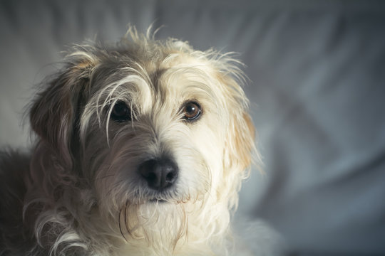 Dog on a sofa, home interior - Puppy resting - Portrait of a little cream terrier dog puppy