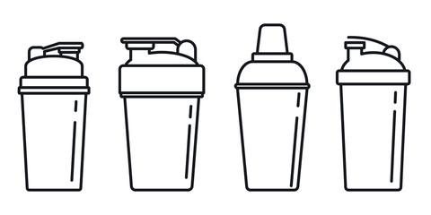 Protein cocktail shaker isolated on white background. Standing and shaking motion process blender cups. Vector illustration of linear icons with editable stroke