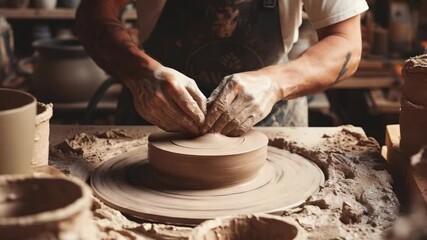Close-up of hands shaping a clay pot on a pottery wheel with clay and spinning wheel in workshop setting