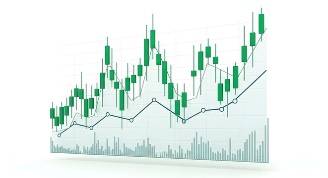 Stock market chart with candle sticks and volume bars showing trading trends and investment analysis isolated on white background