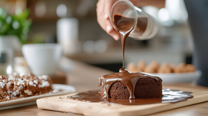 A close-up of rich chocolate sauce being poured over a homemade cake, showcasing the tempting and luscious appeal of chocolate desserts that evoke feelings of happiness and nostalgia.