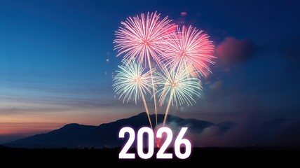 Fireworks Exploding Over Mountains at Dusk Celebrating the New Year 2026 Festive Scene with Vibrant Colors and Hopeful Atmosphere