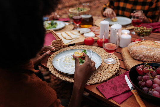 Portrait of diverse group of african amaerican friends enjoying delicious meal outdoor, multi cultural multi ethnic gathering