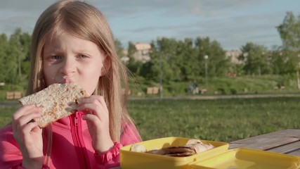 Little blonde girl in pink clothes bites sharma from yellow lunch box. Cute elementary school student sitting at a wooden table and eating lunch in outside.