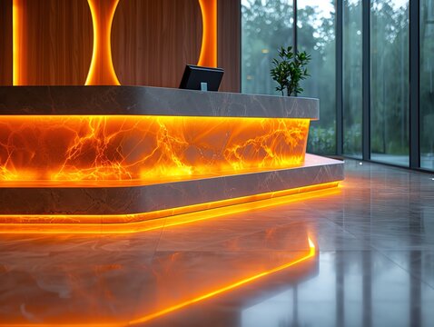 Closeup of a glowing, modern reception desk, with sharp contrasts and leading lines