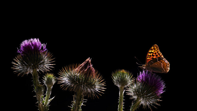 Butterfly perched on vibrant thistles against black background