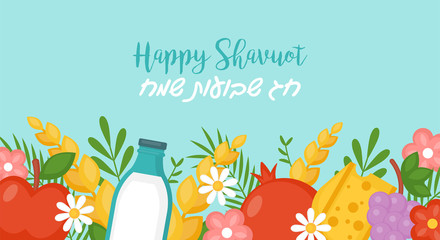 Jewish holiday shavuot concept with fruits, wheat and milk bottle. Vector illustration. Text in Hebrew: "Happy Shavuot"