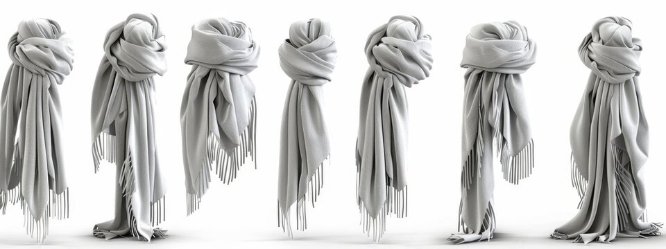 Several different angles of a white knitted woven wool fleece scarf shawl wrap mockup template. Front and flat lay views on transparent cut out PNG.