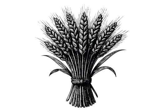 Wheat sketch. Vector set with grain in a jute sack and wheat ears. Illustration of a bunch of spikelets, a sheaf of wheat. Engraved style.
