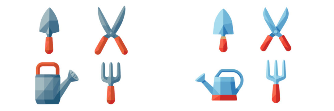 Gardening tools including watering can, trowels, and shears in geometric design on a clean white background for gardening activities