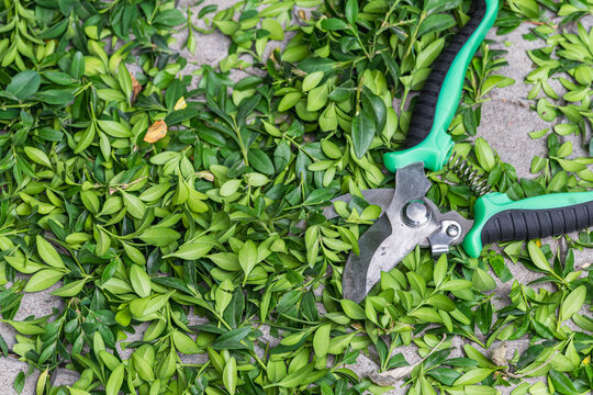 Garden pruning shears lie on cut boxwood leaves. Garden care concept.