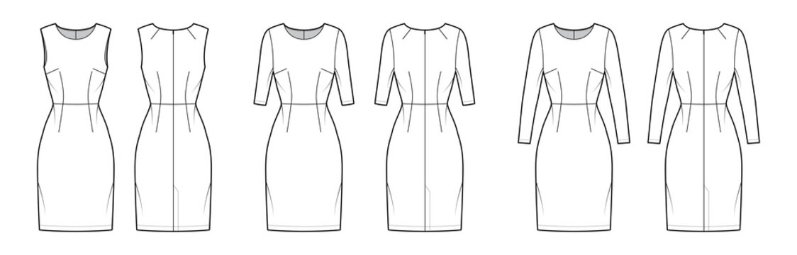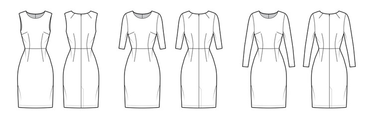Set of Dresses sheath technical fashion illustration with natural waistline, long elbow short sleeves sleeveless, fitted body, knee length. Flat apparel front, back, white color. Women, men unisex CAD
