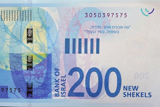 New Israeli money bills (banknotes) of 200 shekel close-up