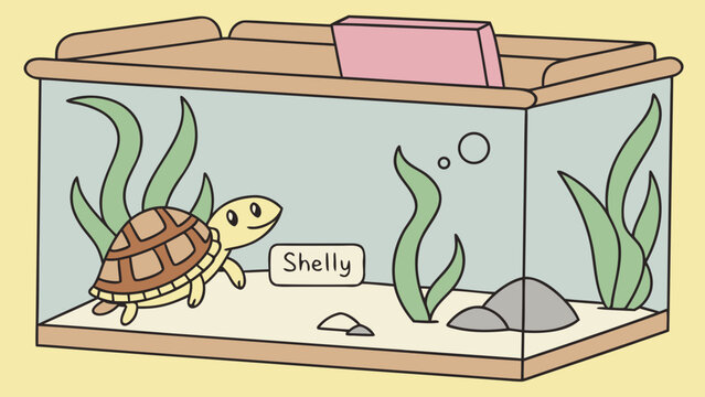 Illustration of a turtle named shelly swimming in a tank with plants and rocks on a yellow background