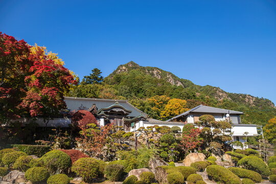 Autumn leaves and mountain at japanese temple Okuboji , Sanuki city, Kagawa, Shikoku, Japan