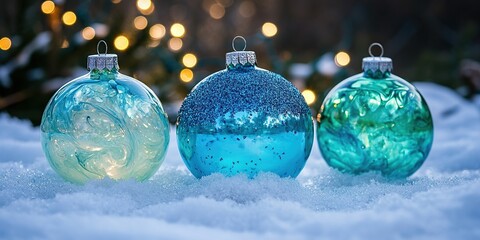Three shimmering blue glass ornaments rest on a blanket of fresh snow, illuminated by twinkling fairy lights in the background.