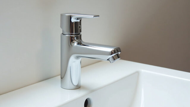 A modern white sink with shiny chrome faucet sits in the interior of a clean bathroom