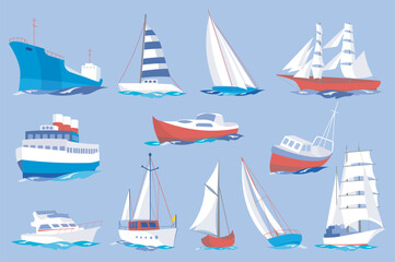 Set of wooden pirate ship illustration. Cartoon sailing ship isolated on white background