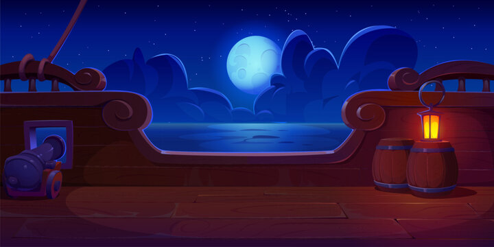 Night landscape of the deck of a wooden pirate ship. Cartoon vector mysterious twilight view from a corsair boat board under a full moon with peaceful ocean, glowing lanterns, wooden barrels, a cannon