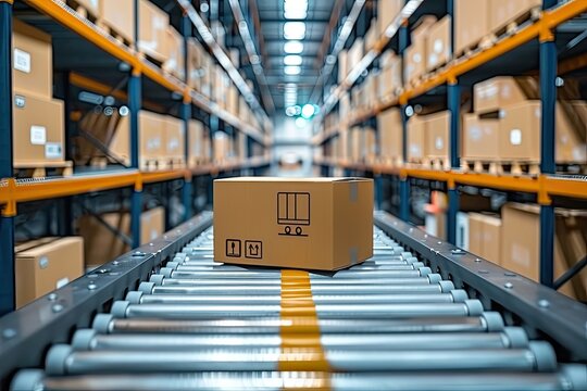 Cardboard box on a conveyor belt in a warehouse with shelves full of packages. Concept of logistics, shipping, and storage.