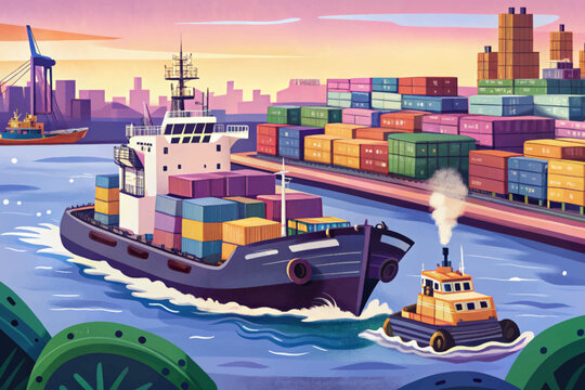 Tugboat guiding large cargo vessel into busy harbor, maritime teamwork scene wallpaper cartoon