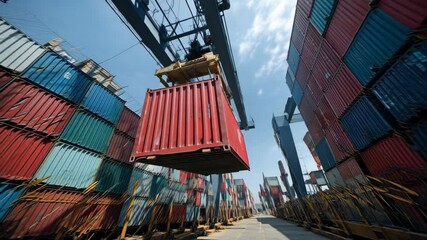 A worker guides hanging shipping container amidst busy port activity