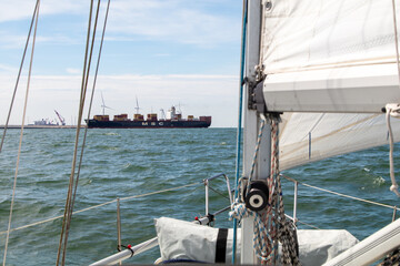 Large cargo ship crossing in front of sailboat in shipping lane