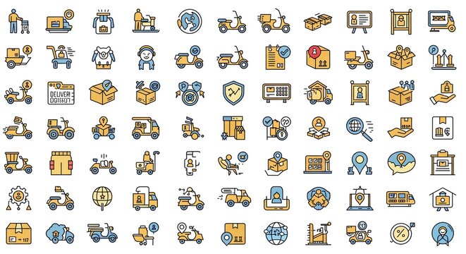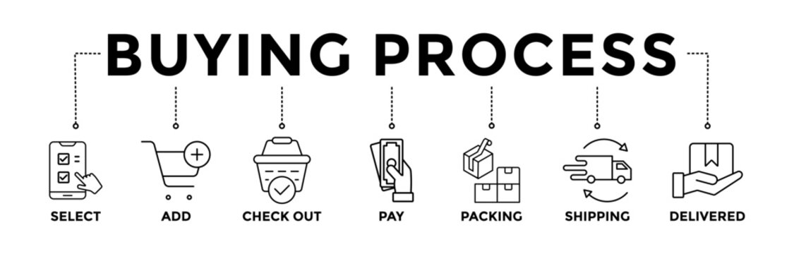 Buying process banner icons set with black outline icon of select, add, check out, pay, packing, shipping and delivered