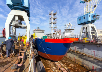 Shipyard ship moored in floating dock on boat sleepers under ship Maintenance with sunset, Front View of Vessel repair on sepia tone.