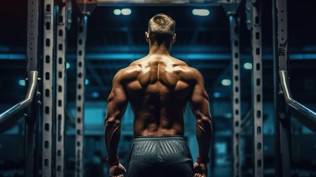 Rear view of three diverse shirtless fit men exercising outside, doing chin-ups on a climbing frame