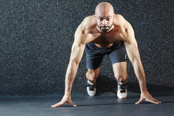 Motivational portrait of shirtless muscular man standing in start stance determined to run long distance, looking at camera