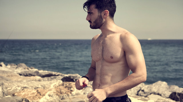 sexy man on the beach takes from the refrigerator a bottle of cold water