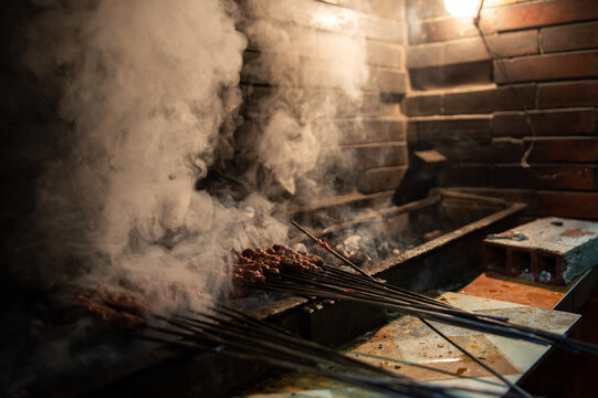 Cooking Shish Kebab in Morocco, smoke rising in the air