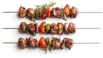 Metal skewers with delicious shish kebabs isolated on white, top view