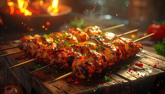 Skewered, grilled chicken shish kebabs atop wooden block, parsley garnish, soft-focus background with fire pit