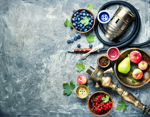 Stone hookah head on old rustic table with fruit flavoured tobacco