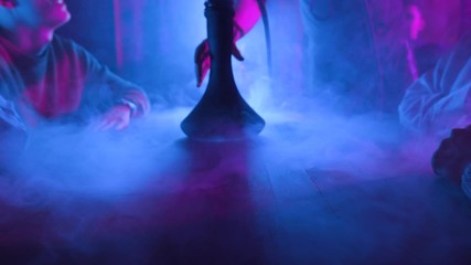 Friends in dark bar talking enjoying hookah at the bar feeling happy young friendship communicate emotion shisha smoker male lounge handsome female vape beautiful attractive company relax slow motion