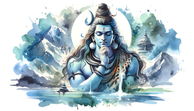 Watercolor painting illustration of lord shiva in meditation with a trident.