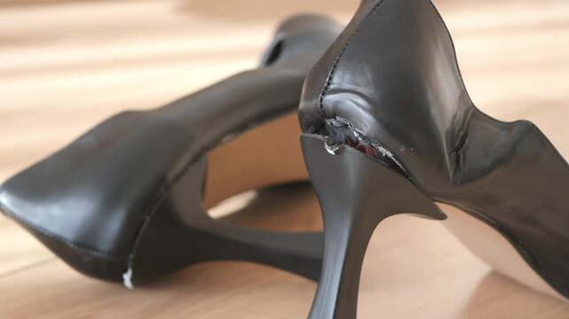 Close-up hands of male shoemaker holds old light brown leather shoe and repaired shiny shoes after restoration working. Concept of cobbler artisan repairing and restoration work in shoe repair shop.