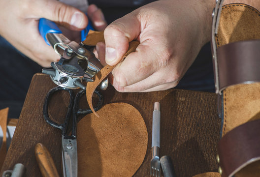 Tailor cobbler hold different rolls natural brown leather, working with textile in workshop