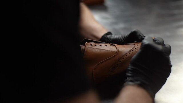 Back view of shoemaker wearing black latex gloves cleaning old light brown leather shoes with rag for later restoration, close-up. Process of repairing shoes by cobbler in shoe repair shop.