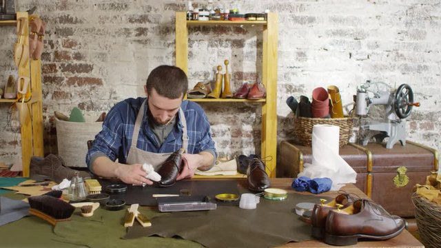 Tracking shot of professional male shoemaker in apron sitting at desk in workshop and polishing leather boot with cloth wrapped around fingers