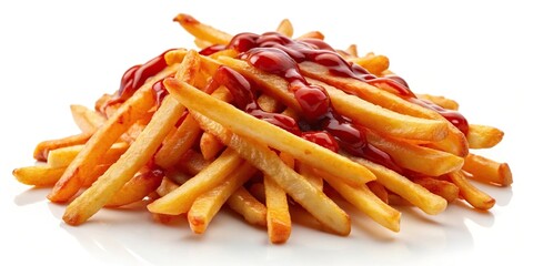 Thin shoestring fries lightly drizzled with ketchup isolated on a white background
