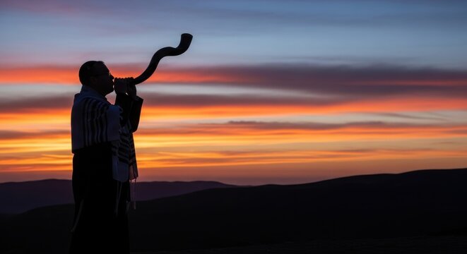 blowing shofar trumpet bibcal feast jewish christian sun down evening bibical