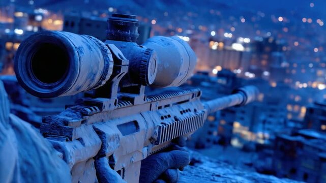 Sniper rifle at night, icy urban setting