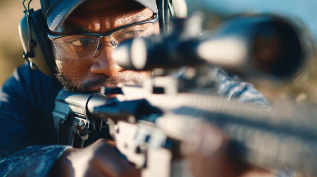 Action shot of a shooter in mid-aim, rifle steady, glasses and earmuffs visible, bullseye in the background slightly blurred, emphasizing concentration and accuracy