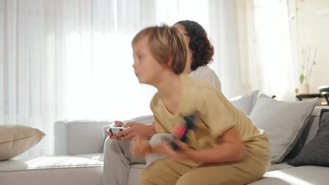Smiling family celebrating parents day with children playing games